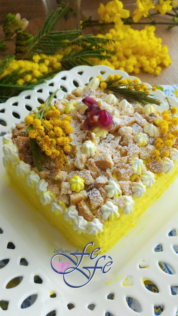 Une fois la pâte biscuit refroidie, découpez d’environ 1 cm les bords extérieurs qui sont toujours les plus secs et découpez-la en 4 parts égales ou selon votre préférence. Les bords irréguliers vous serviront à créer l’effet mimosa sur la surface. Assemblez ensuite le gâteau. Badigeonnez chaque couche avec un mélange d’eau et de limoncello et garnissez avec la fausse crème diplomatique jusqu’à obtenir 4 strates. Sur la dernière, ajoutez la crème restante et enfin un peu plus de crème pâtissière.