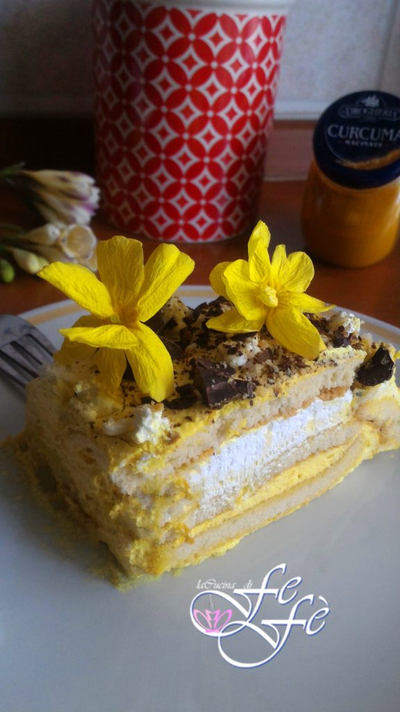Pour la garniture, j’ai choisi une crème pâtissière sans œufs aromatisée à la curcuma pour garantir non seulement une couleur solaire et vive, mais aussi profiter des propriétés bénéfiques de cet ingrédient, idéal pour un dessert qui veut rester « sain ».