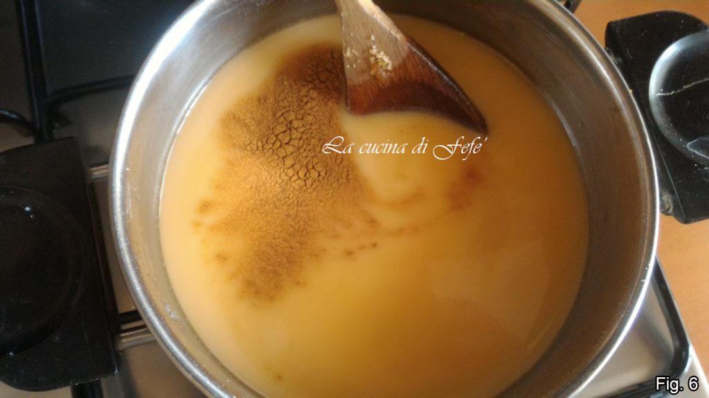 Ajoutez au mélange aussi le sucre, remettez la casserole sur le réchaud à feu modéré et mélangez avec une cuillère en bois.