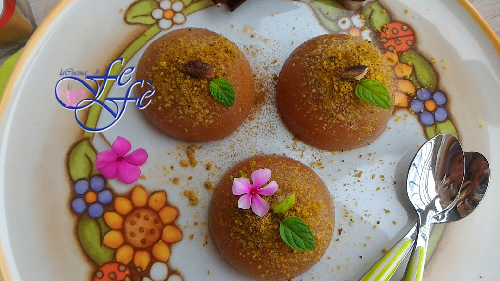 Il y a quelques soirs, en discutant comme d’habitude de cuisine avec ma cousine, j’ai découvert que je n’avais jamais écrit sur le blog la procédure d’un des desserts les plus connus en Sicile, la gelée à la cannelle ! À sa demande, je me suis donc aussitôt mise au travail pour remédier à cet oubli ! Et comme on dit dans ces cas-là, j’ai fait d’une pierre deux coups, en satisfaisant le désir d’une personne que j’aime et en enrichissant mon blog d’une autre recette de ma chère terre. N’oublions pas qu’on ne parle pas seulement de cuisine en fournissant les dosages et la procédure, mais en entrant dans un véritable patrimoine de connaissances ! Voilà pourquoi je veux d’abord faire une précision nécessaire pour ceux qui ignorent la signification derrière le nom de ce dessert typique. Le terme gelée peut en effet laisser entendre qu’il s’agit d’une sorte de glace ou de sorbet, mais c’est en fait une expression sicilienne se référant à un flan. La gelée a en effet une consistance gélatineuse, due à l’ajout de fécule de maïs parmi les quelques ingrédients qui la composent. Il en existe plusieurs variantes selon les disponibilités saisonnières, comme celle au melon ou à la pêche d’été, et aux amandes d’hiver. Dans ce cas, elle est fortement aromatisée à la cannelle. Donc, si vous êtes amateurs de cette épice précieuse et polyvalente, vous ne pourrez absolument pas manquer la procédure pour la réaliser ! J’ai choisi de garnir ma gelée avec de la farine de pistache de Bronte, comme le veut la tradition, mais rien ne vous empêche de la servir avec de la crème fouettée ou ce que votre imagination vous suggérera !