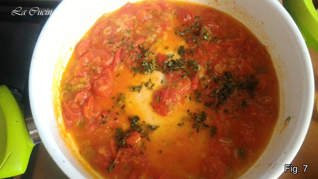 Ajoute les tomates cerises, baisse le feu et mets le couvercle. Fais cuire pendant environ 10′-12′ en ajoutant un peu d’eau si nécessaire.