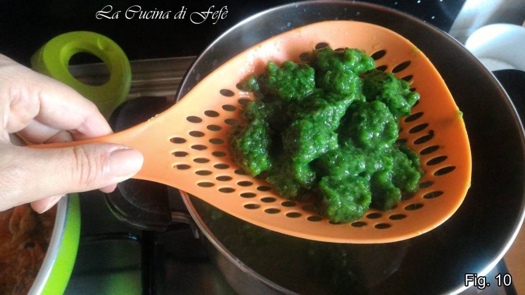 Dans une grande casserole, porte à ébullition beaucoup d’eau salée, puis, positionne-toi avec la poche à douille au-dessus de la casserole et presse environ 3 cm de mélange d’épinards à la fois. À ce stade, très rapidement, coupe-les en utilisant des ciseaux de cuisine, en les laissant tomber dans l’eau.
