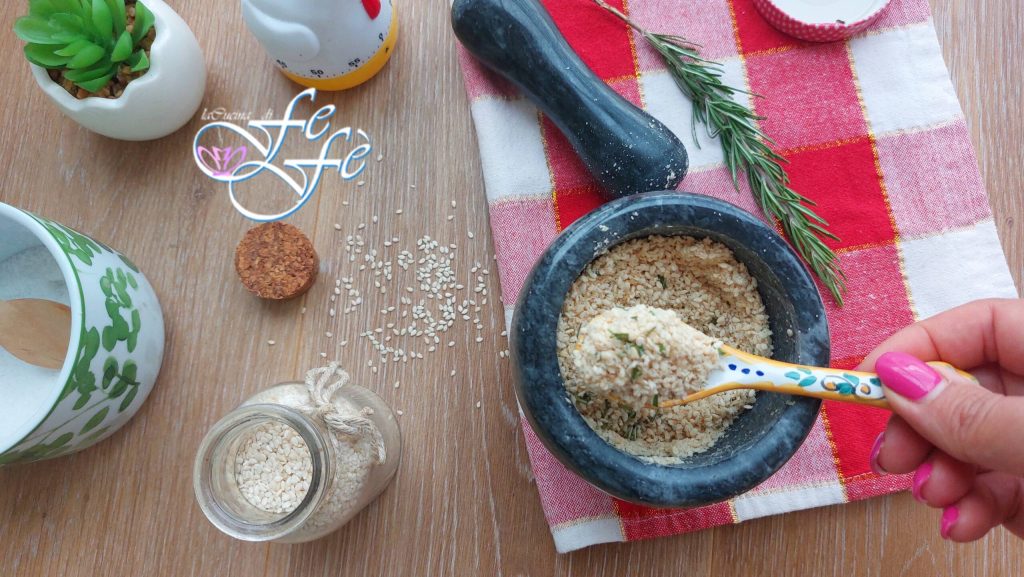 Cela peut sembler un mot étrange, mais le gomasio, aussi appelé kantatsu, est un excellent condiment utilisé dans la cuisine japonaise pour remplacer le sel. Il est composé justement d’un faible pourcentage de sel marin et le reste uniquement de graines de sésame grillées et broyées ! Parfois, il est enrichi aussi d’algues, d’épices et d’herbes aromatiques et il est principalement utilisé pour assaisonner une variété de préparations, des salades aux légumes, de la viande au riz, mais il s’accorde encore mieux aux céréales car il accentue leur saveur agréable, leur donnant un coup de pouce supplémentaire. Son utilisation est maintenant très répandue, car il permet d’assaisonner les plats de manière intelligente sans excéder les quantités de sodium, qui, comme nous le savons, sont déjà présentes dans de nombreux aliments, surtout transformés, donc le réduire est vraiment important pour notre santé ! La magie est faite par les graines de sésame , qui, comme je l’ai expliqué lorsque je vous ai montré comment réaliser la tahina faite maison, sont également très riches en protéines, vitamines et calcium, encore plus que le lait et les fromages. De plus, dans cette préparation, la présence du sel est rendue inactive par l’action de l’huile des graines de sésame, ce qui ne lui permettrait pas d’absorber de grandes quantités d’eau. Résultat ? Un aliment assaisonné avec le gomasio ne provoquera aucune sensation particulière de soif et garantira de nombreux avantages d’un point de vue thérapeutique et curatif. Pour cette raison, il est plus sain d’utiliser ce préparé plutôt que d’assaisonner uniquement avec du sel.