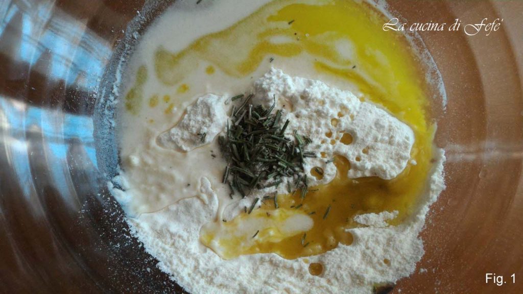 Rassemblez dans un grand bol les deux farines, l’huile, l’eau pétillante et le romarin (fig. 1).