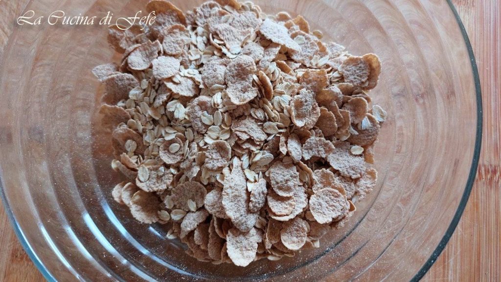 Préparer la granola maison est très simple. Dans une grande terrine, réunis et mélange les flocons d’avoine avec les flakes d’épeautre sans sucres.