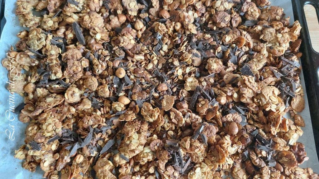 Après ce temps, mélange délicatement avec une spatule pour la retourner sans la trop émietter, remets au four toujours ventilé en abaissant la température à 160°C et poursuis la cuisson pour encore 10′. Bien sûr, de four à four, comme je le dis souvent, les temps peuvent légèrement varier donc je conseille toujours de vérifier souvent pour éviter qu’elle ne brûle.