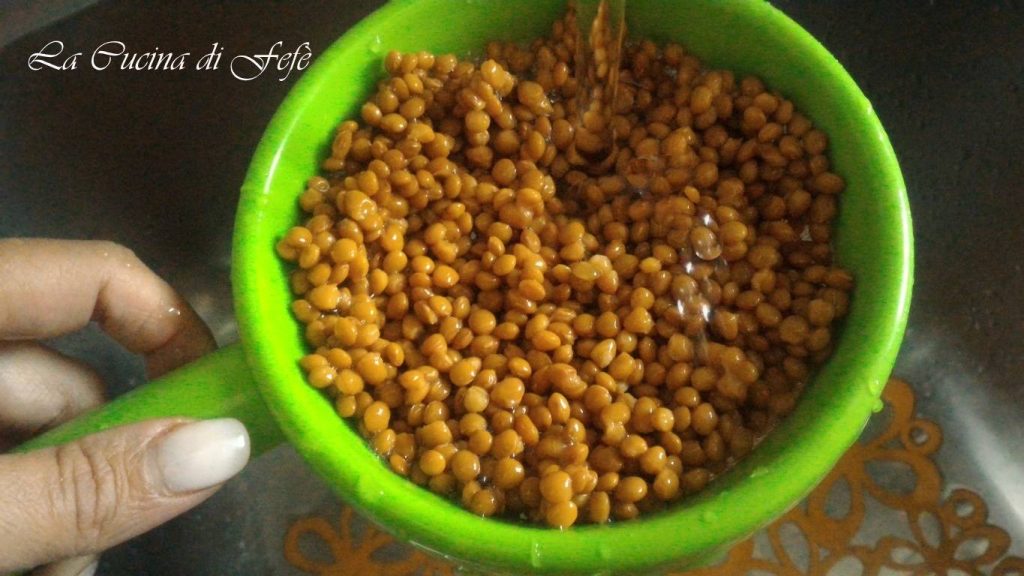 Commencez par rincer abondamment les lentilles précuites sous l’eau courante à l’aide d’une passoire.