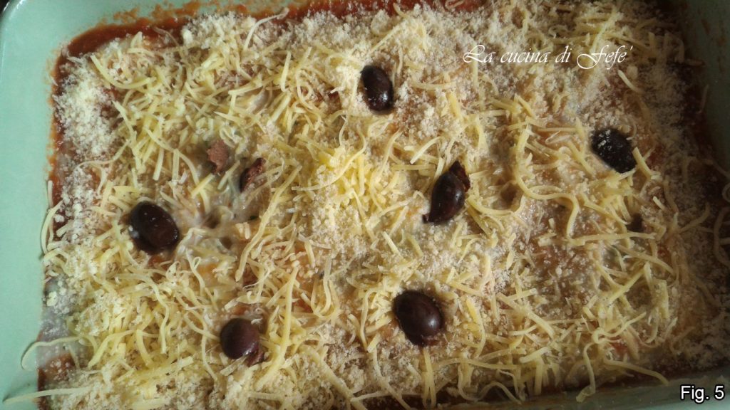 • Recouvrez avec quelques cuillères de provola râpée ou en petits dés, si vous le préférez, et tout autant de parmesan râpé. Assaisonnez avec une poignée d’olives dénoyautées et continuez à composer 4 couches au total ou jusqu’à épuisement de tous les ingrédients (fig. 5).