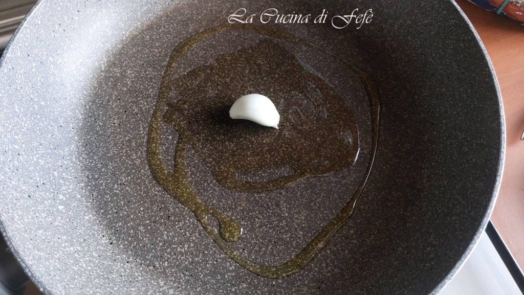 Pendant ce temps, dans une poêle antiadhésive, fais revenir à feu vif la gousse d’ail avec un beau filet d’huile.