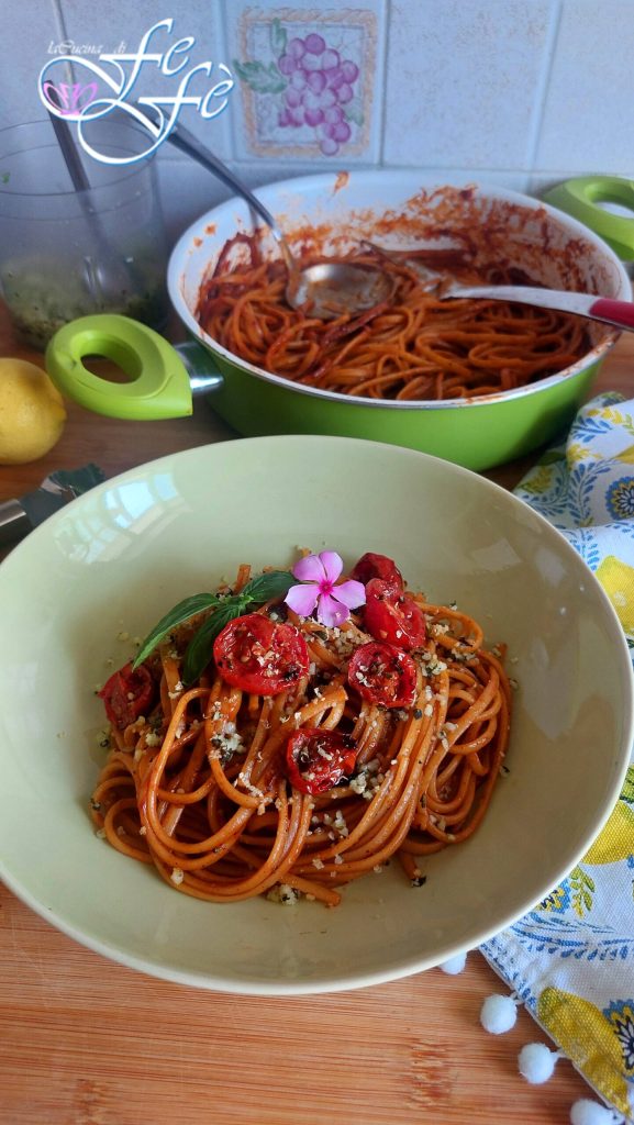 Enfin un peu de fraîcheur, les températures ont légèrement baissé et nous pouvons profiter d’une petite pause de cette chaleur accablante ! J’en ai profité pour expérimenter un plat principal différent des habituelles salades de pâtes auxquelles je vous ai habitués jusqu’à présent et qui vous fera littéralement tomber amoureux ! Je viens de mentionner que j’ai saisi l’occasion parce que pour préparer la crème avec laquelle ces linguines seront assaisonnées, il faut allumer le four pendant environ une heure et demie et ce n’est pas faisable si l’air à l’extérieur n’est pas plus que frais et agréable ! Donc, à moins que vous ne fassiez partie de ces rares courageux qui allument le four en toutes circonstances, je vous recommande vivement ce plat uniquement si le climat est tel que vous pouvez faire ce petit sacrifice, qui, je vous le jure, en vaudra vraiment la peine ! La garniture si audacieuse en question, n’est autre à base de tomates confites, que j’adore à la folie, mais mixées jusqu’à devenir une crème pour les pâtes, je ne les avais jamais essayées ! Pour ceux qui ne le savent pas, le terme confit signifie « candied », en effet les tomates cerises sont coupées en deux, assaisonnées d’herbes aromatiques, d’huile, de sel, de poivre et de sucre de canne, et enfin cuites au four lentement jusqu’à caramélisation parfaite ! À la fin de la cuisson, elles seront tendres, savoureuses et très parfumées, et déjà ainsi, vous pourrez les utiliser comme accompagnement délicieux, mais il y a quelque temps, j’ai vu à la TV un chef les mixer pour assaisonner des pâtes, et j’ai littéralement adoré cette idée ! J’ai ensuite personnalisé le plat avec un crumble à base de parmesan et de basilic et une note fraîche et parfumée à la fin à base de zestes de citron ! Je vous le dis, à la première bouchée, vous ressentirez une explosion de goût incroyable, alors préparez-le pour les grandes occasions, car il deviendra le parfait plat principal de style gourmet du dimanche capable d’étonner vos convives en quelques gestes simples !
