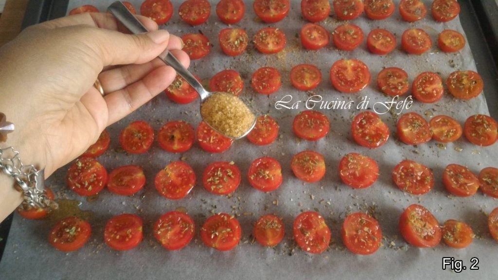 Disposez les tomates cerises face ouverte vers le haut sur une plaque de cuisson recouverte de papier sulfurisé, répartissez du sel à votre goût, du poivre moulu, de l’origan, un filet d’huile sur toutes les tomates cerises et enfin le sucre de canne. Cuisez dans un four préchauffé à 150°C pendant environ 1h20′ ** (fig. 2).