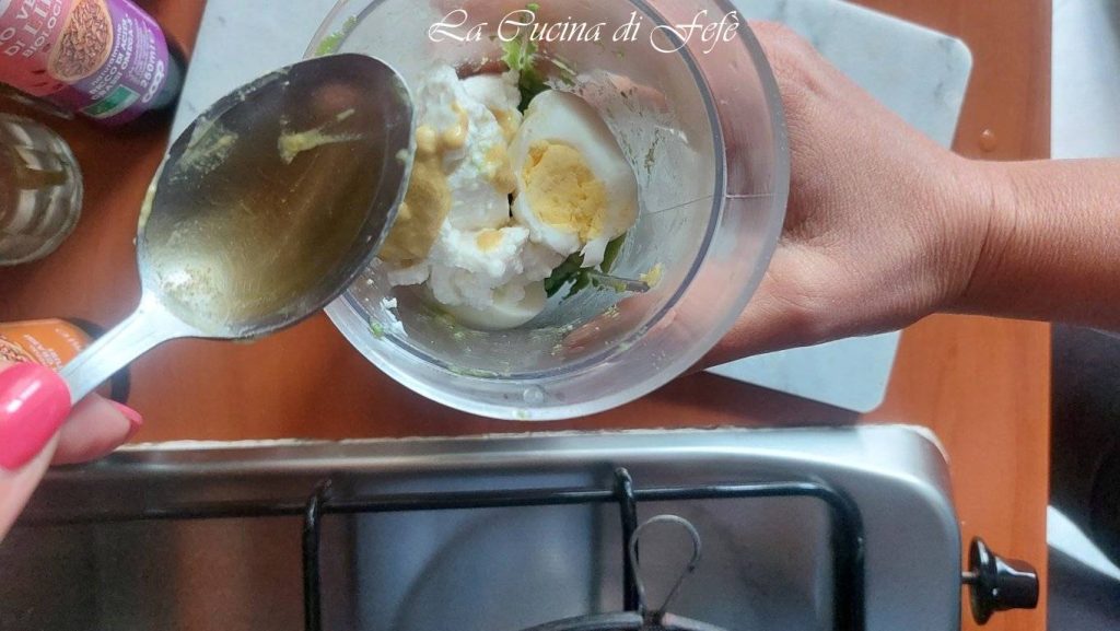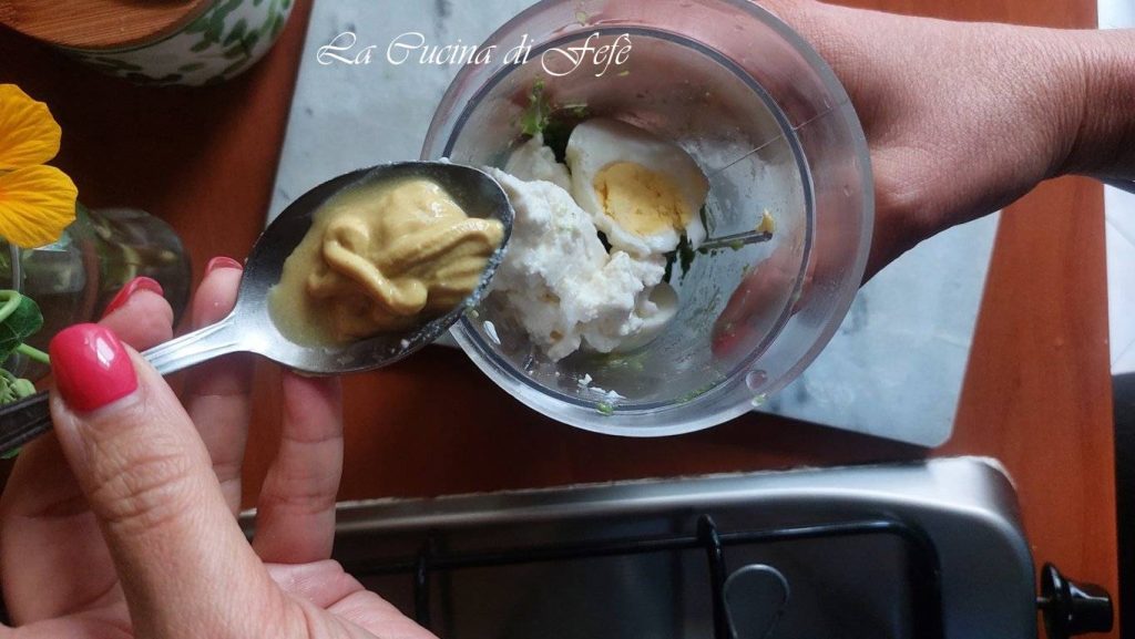 Ajoute maintenant l‘œuf dur maintenant froid, épluché et préalablement coupé en quartiers, la ricotta et la moutarde.