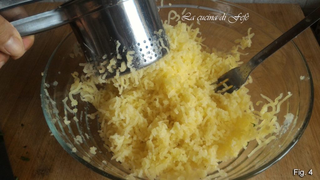 Quand les champignons ont refroidi, ajoutez-les à la purée de pommes de terre (fig. 5). À ce stade, ajoutez l’œuf, une pincée de sel et de poivre à votre goût (fig. 6).