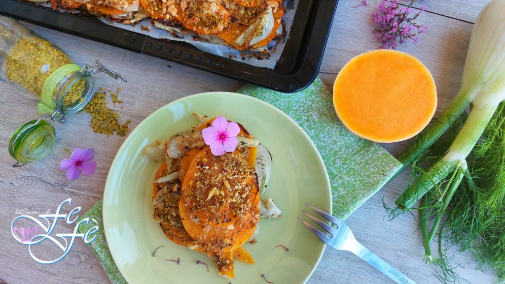 Si vous voulez épater amis et famille avec un plat pratique, rapide et qui fait toujours son effet, vous devez absolument essayer ce mille-feuilles de courge et de fenouils au four ! Ils sont faciles à préparer car, une fois les deux légumes principaux nettoyés, on les ajoute tous les deux crus ! Oui, vous avez bien entendu ! Il suffit de les couper très finement, sous peine d’altérer le résultat final, et de composer trois couches directement dans le plat. Évidemment chaque couche devra être assaisonnée d’un beau mélange d’herbes aromatiques — mettez-en beaucoup si vous aimez — mais je conseille de laisser le thym frais prédominer, je vous jure, il révèle les saveurs merveilleusement ! Quelques autres ingrédients, dont de la farine, mais mieux encore des éclats de pistaches si vous en avez dans vos placards, pour un plat tout en style végétarien avec une croûte à se lécher les doigts ! Il sera parfait aussi bien en accompagnement, légèrement tiédi et coupé en carrés, que comme plat principal à base de légumes, pour un repas plus frugal et léger, comme on aime. Bref, faites comme vous préférez, l’important est de vous mettre aux fourneaux et de le servir immédiatement ! Vous allez en tomber amoureux !