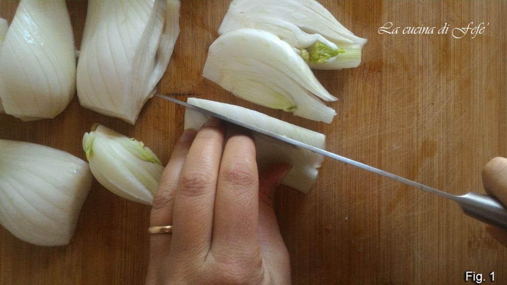 Commencez par laver et préparer les fenouils, éliminez les parties vertes et détachez du bulbe les différentes tiges à la base que vous pourrez utiliser pour parfumer une soupe. Coupez chaque fenouil en 4 puis en fines tranches (fig. 1).