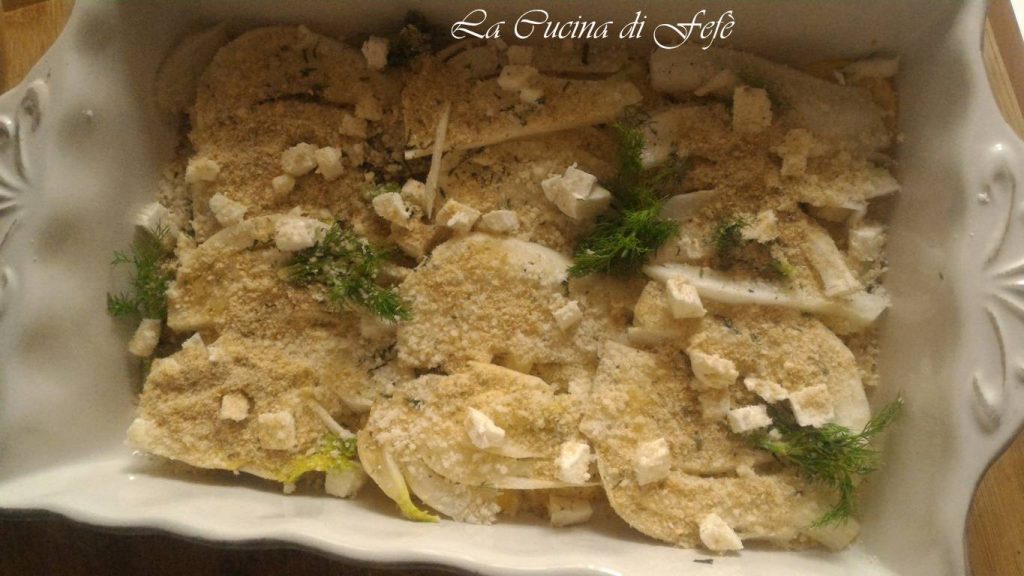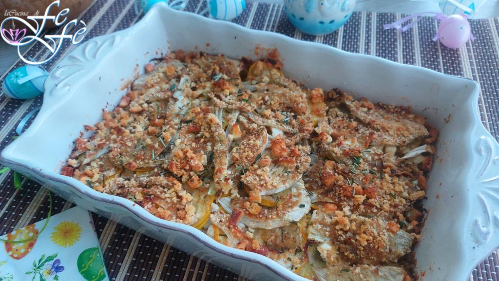 • Enfin, formez la quatrième et dernière couche jusqu’à ce que tous les ingrédients soient épuisés. Complétez avec une bonne quantité de chapelure en surface, de préférence plus grossière, un autre filet d’huile et faites cuire dans un four préchauffé à 190°C pendant environ 40′ ou jusqu’à ce que les dents d’une fourchette s’enfoncent facilement jusqu’au fond et qu’une belle croûte dorée se soit formée.