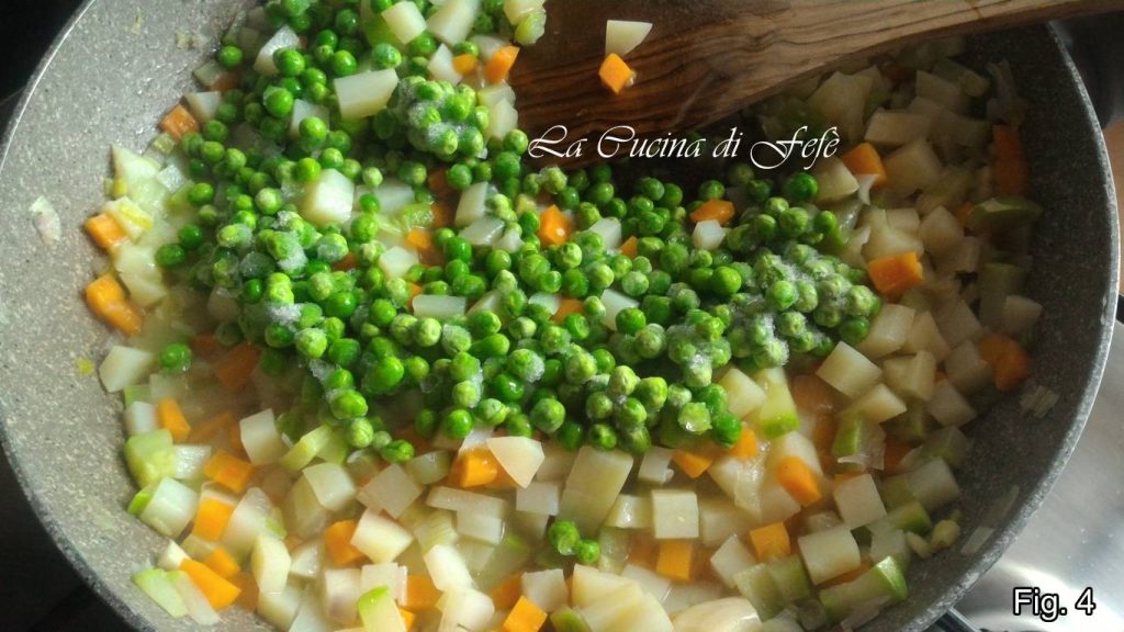 Ajoutez un peu d’eau chaude, couvrez avec un couvercle et faites cuire 15′ à feu doux. Après ce temps, ajoutez les petits pois, ajoutez de l’eau chaude si nécessaire et poursuivez la cuisson pendant encore 5′-8′. Les légumes doivent être tendres (fig. 4). Assaisonnez de sel et de poivre, puis éteignez et parfumez avec du persil au goût (fig. 5).