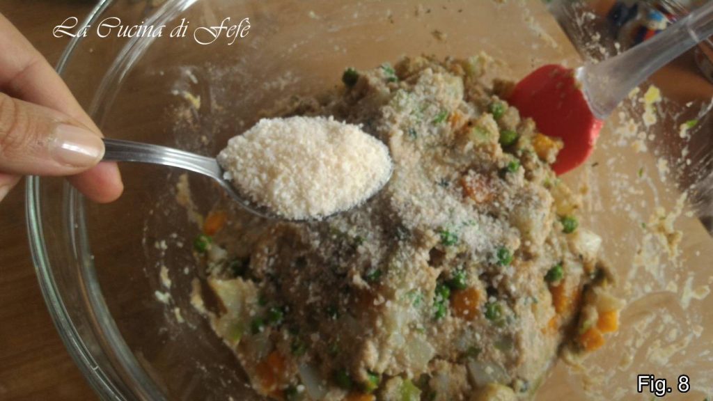 Ajoutez le pecorino râpé et mélangez à nouveau avec une spatule jusqu’à obtenir un mélange compact (fig. 8 et 9).
