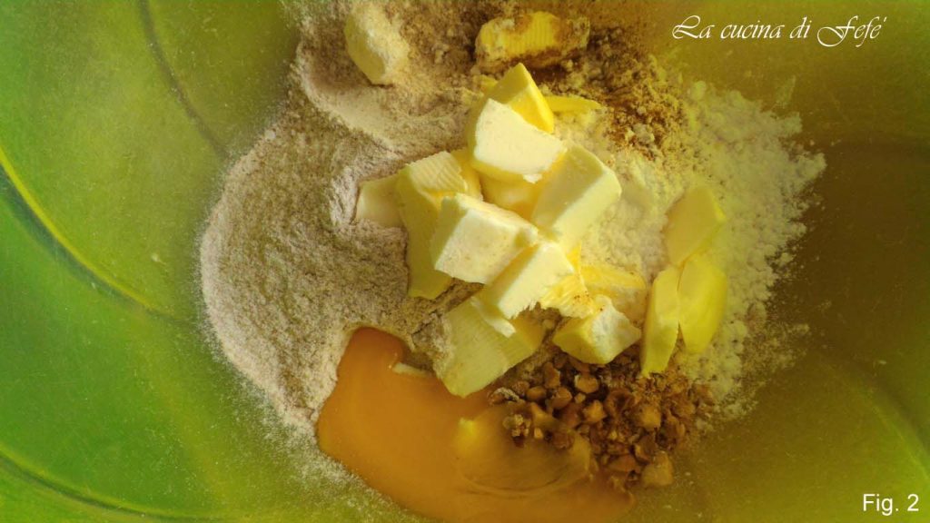 Pendant ce temps, dans un grand bol, travaillez tous les ingrédients pour la base, à savoir la farine, le sucre glace, les noisettes hachées, le beurre froid coupé en dés et le jaune d’œuf (fig. 2).