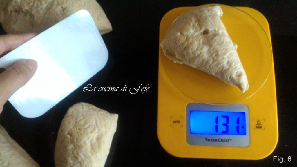 • Renversez le saladier sur le plan de travail et laissez glisser la pâte sans forcer. Procédez à la division en 8 morceaux d’environ 130 g chacun.