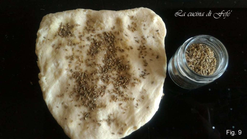 • Étalez chaque portion avec les mains et ajoutez ce que vous voulez : pour ma part j’ai mis des graines d’anis, dans d’autres des tomates séchées à l’huile bien égouttées et hachées, oignon nouveau en rondelles ou olives.