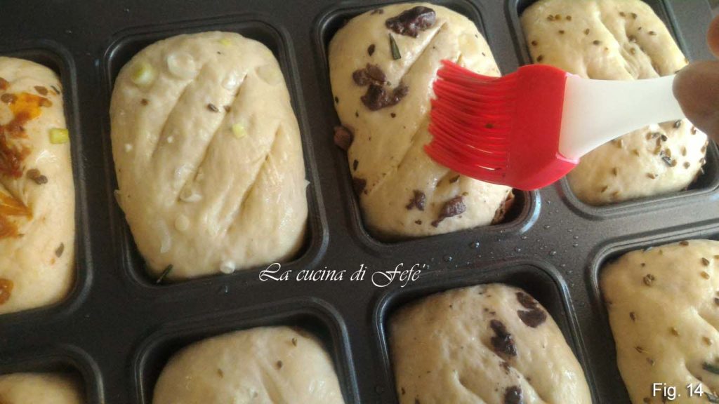 • Placez les pâtons dans les empreintes d’un moule à plum-cake bien huilé ou sur une plaque recouverte de papier cuisson et badigeonnez la surface d’un peu d’eau et d’huile.
