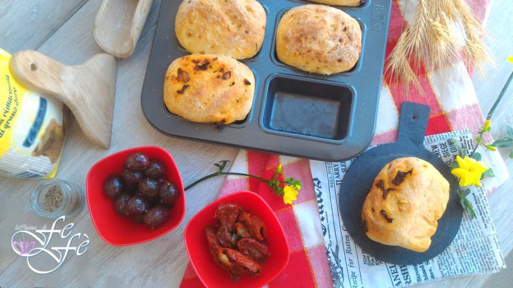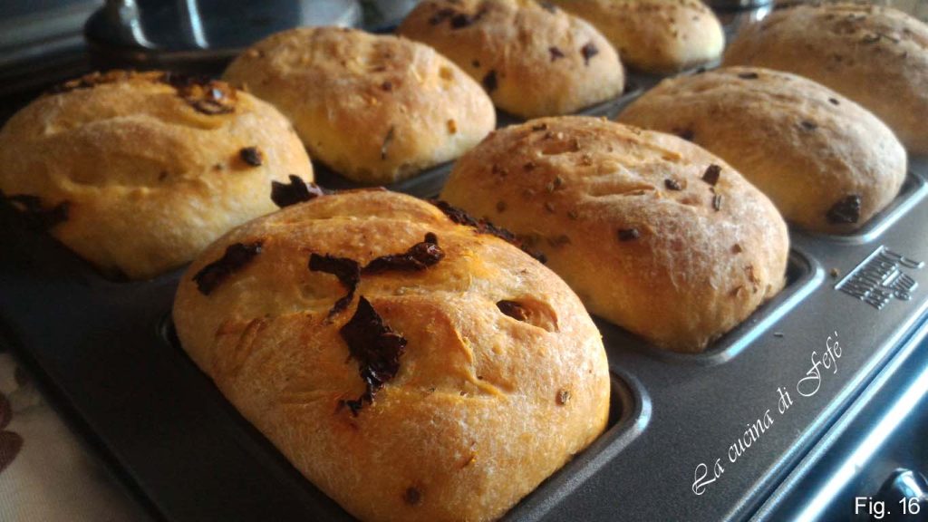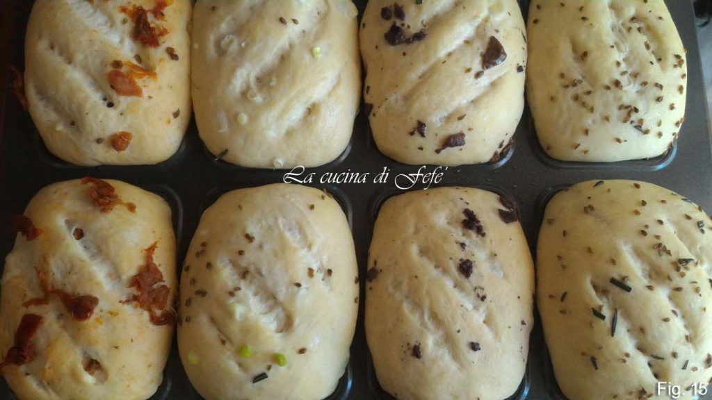 • Enfournez dans un four préchauffé en mode statique à 180°C pendant 35′, en plaçant aussi une petite casserole d’eau chaude pour que la vapeur aide la montée des mini pains et une mie uniforme. Sortez-les du four et laissez tiédir.