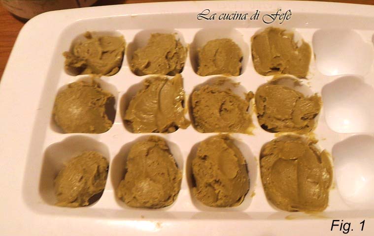 Commencez par verser la crème de pistaches à tartiner dans un moule à glaçons, remplissez 12 cavités et mettez au congélateur pendant environ 15′.