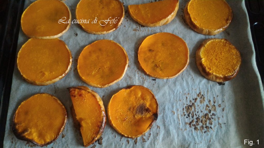 Coupez la citrouille en tranches, avec la peau*, et disposez-la sur une plaque de cuisson recouverte de papier sulfurisé. Cuisez à 190°C pendant environ 30′ ou jusqu’à ce qu’elle soit tendre à la fourchette (fig. 1).