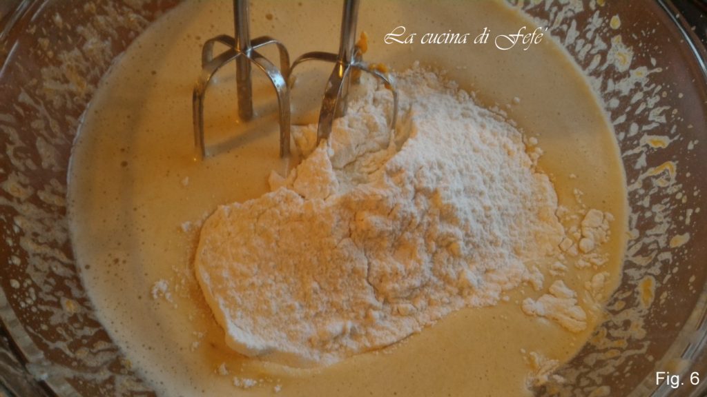 Séparément, mélangez dans un saladier les ingrédients secs, c’est-à-dire la farine et l’amidon tamisés avec la levure et incorporez-les aux ingrédients liquides (fig. 6).