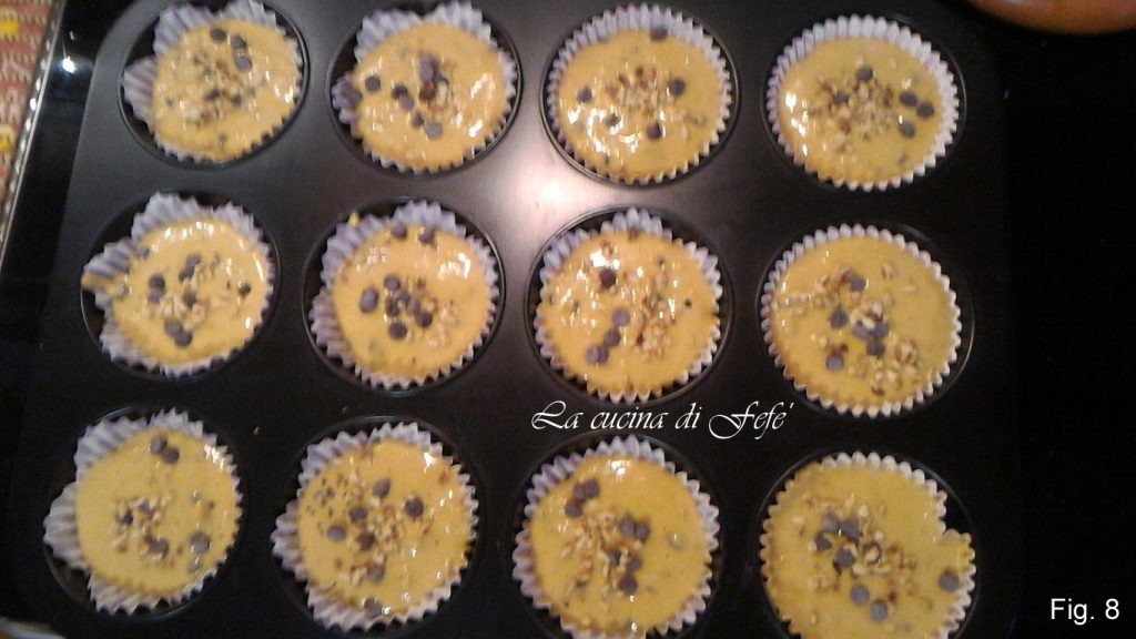 Versez le mélange dans les moules appropriés dans lesquels vous aurez inséré les caissettes typiques. Garnissez la surface de chacun avec une autre poignée de pépites de chocolat et d’éclats de noisettes (fig. 8).