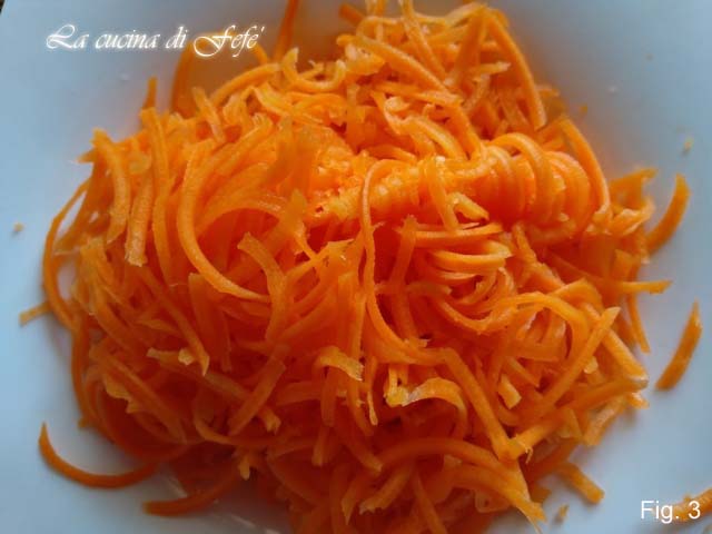 Pendant ce temps, procédez de la même manière pour les spaghettis de carottes en utilisant le coupe-légumes en spirale et en les raccourcissant de temps en temps.