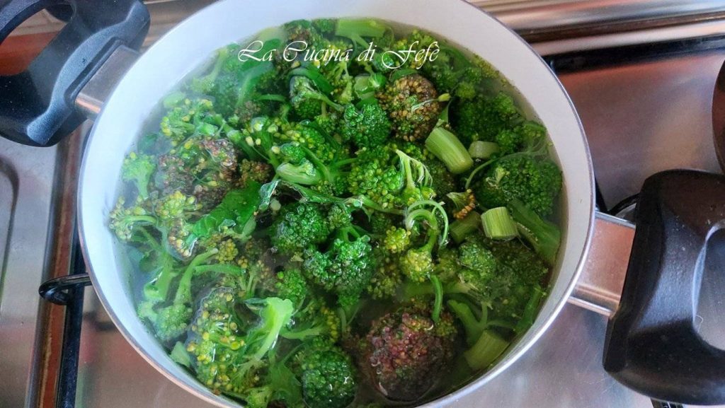 Pendant ce temps, dans une sauteuse, blanchir les têtes de brocoli dans l’eau salée pendant 8′.