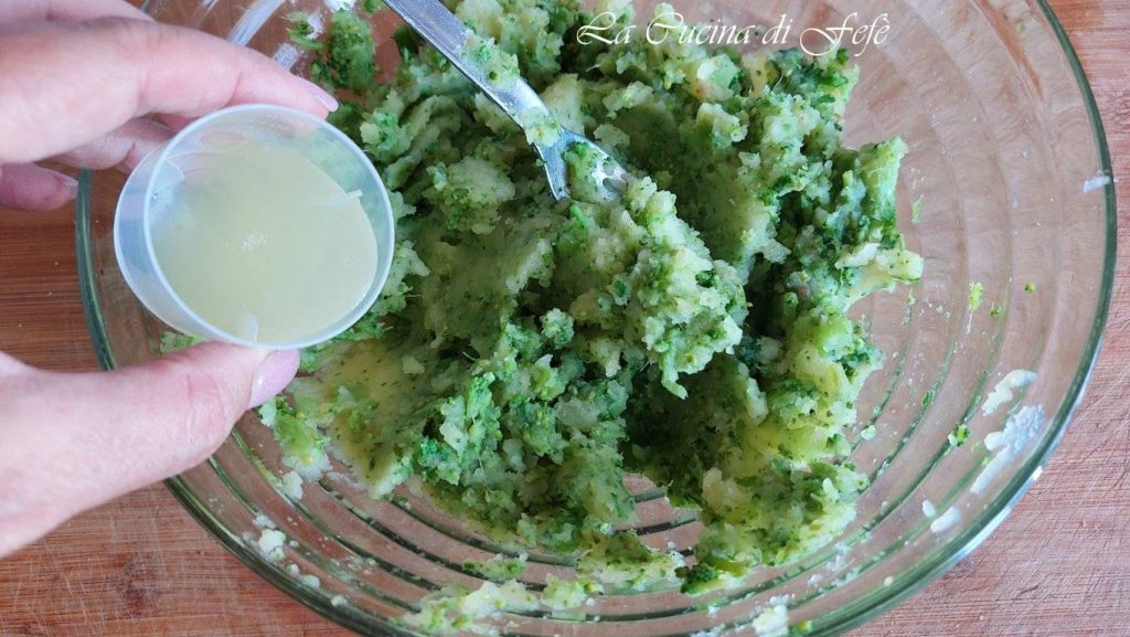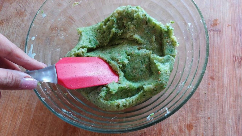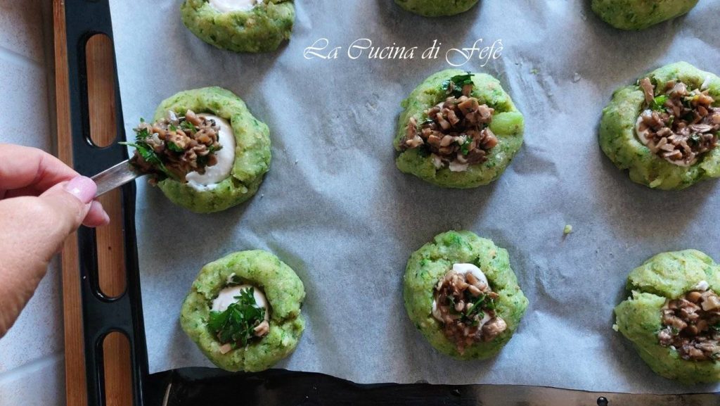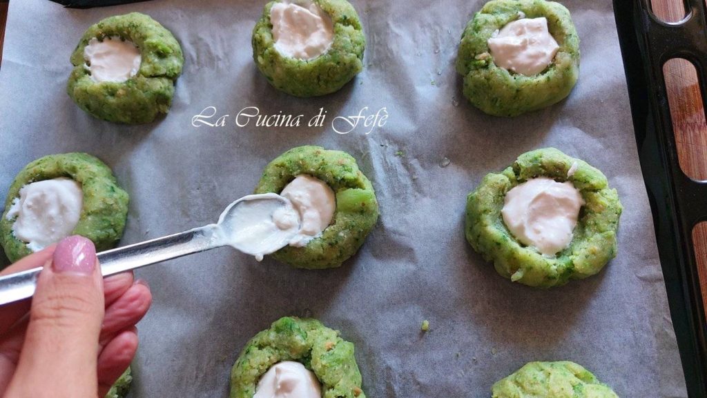 La réalisation est vraiment intuitive. Après avoir cuit les pommes de terre et les brocolis, écrasez-les et assaisonnez-les. Formez des boules et créez un creux central, transformant-les en petits « paniers ».