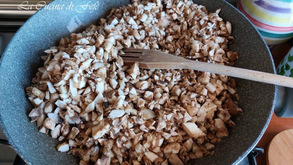 Ajoutez la hachée de champignons et laissez rissoler environ 8′-10′.