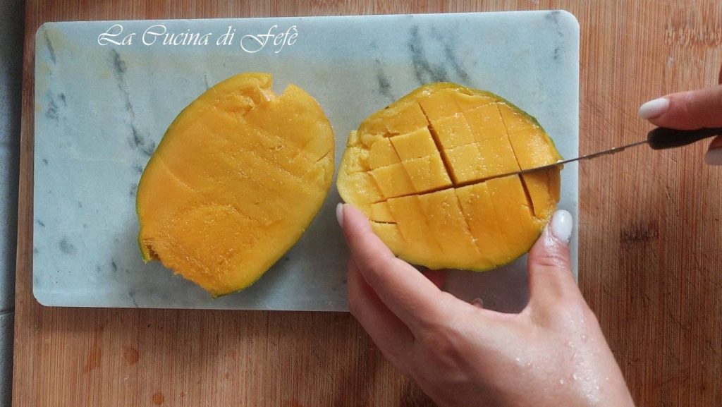 Incisez la joue de la mangue, en réalisant des entailles croisées d’environ 1,3 cm dans la pulpe des deux joues et en veillant à ne pas percer la peau.