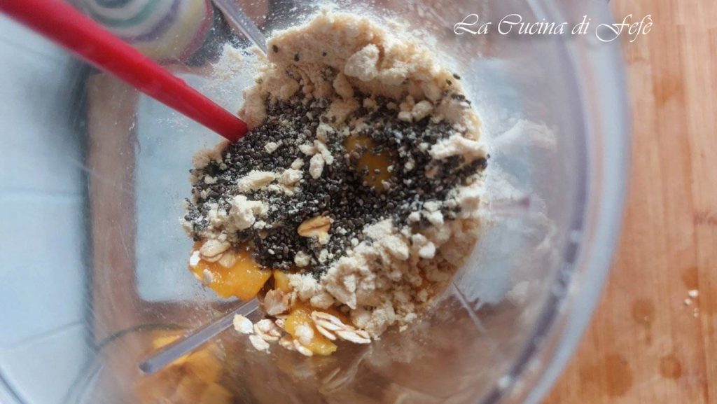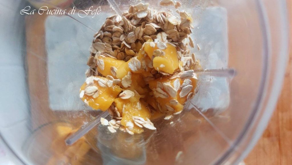 Avec l’aide d’une cuillère, extrayez la pulpe et transférez-en environ 70 gr. dans un mixeur avec les flocons d’avoine, en réservant le reste pour la décoration finale.