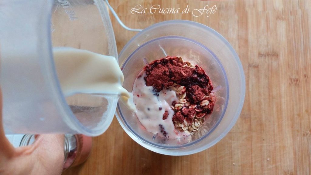 Dans le bol d’un mixeur, mélange les graines de chia, les flocons d’avoine, la poudre de betterave et le lait végétal (j’ai choisi celui de quinoa et riz non sucré).