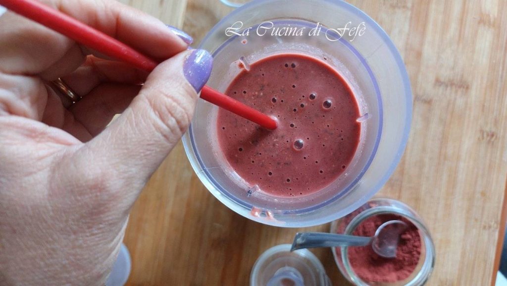 Ferme avec le couvercle du mixeur et commence à mixer par à-coups pendant une demi-minute jusqu’à obtenir un mélange homogène et encore assez liquide. Mélange avec une louche, referme le couvercle et mets au réfrigérateur pour raffermir temporairement (au moins 20′).