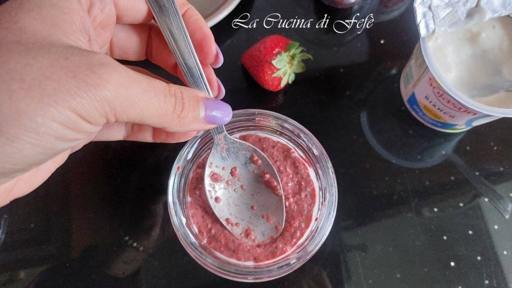 Après le temps de repos, les graines de chia auront absorbé tout le liquide et auront doublé de volume, atteignant la consistance d’une sorte de pudding. Ajoute environ 2 cuillères à soupe de ce pudding pour chaque pot afin de créer une première couche.