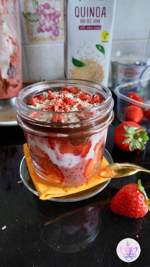 Dernièrement, j’expérimente une foule de recettes pour un petit-déjeuner sain et équilibré, puisque cette attention m’a aidée à débloquer le métabolisme ! L’overnight oatmeal est l’une des nombreuses solutions capables de répondre à ce besoin car il a un fort pouvoir rassasiant et permet de ne pas arriver affamé au repas suivant ! Comme déjà expliqué, cette idée de petit-déjeuner typique des pays anglo-saxons, est très pratique et rapide car sans cuisson, il suffit de le préparer la veille pour le retrouver prêt et le déguster le lendemain matin ! Les flocons d’avoine (oatmeal) sont en effet dissous dans du lait végétal avec des graines de chia, puis laissés reposer toute la nuit (overnight). Vous obtiendrez une sorte de pudding, que dans cette version j’ai enrichi avec des tranches de fraises fraîches, en profitant de leur saisonnalité, noix de coco râpée, yaourt et crème de cacao. J’ai créé un jeu de couleurs, car l’œil aussi veut sa part, et de textures vraiment irrésistible ! Le matin, il suffira de garnir juste avant de déguster avec d’autres fraises fraîches ou lyophilisées et de plonger la cuillère ! Je te laisse ma version sans sucres ajoutés car pour mon palais ceux naturels de la noix de coco et des fraises suffisent, mais si tu veux, tu peux sucrer à volonté, mais attention avec parcimonie. Essaie-le et tu en tomberas amoureux !