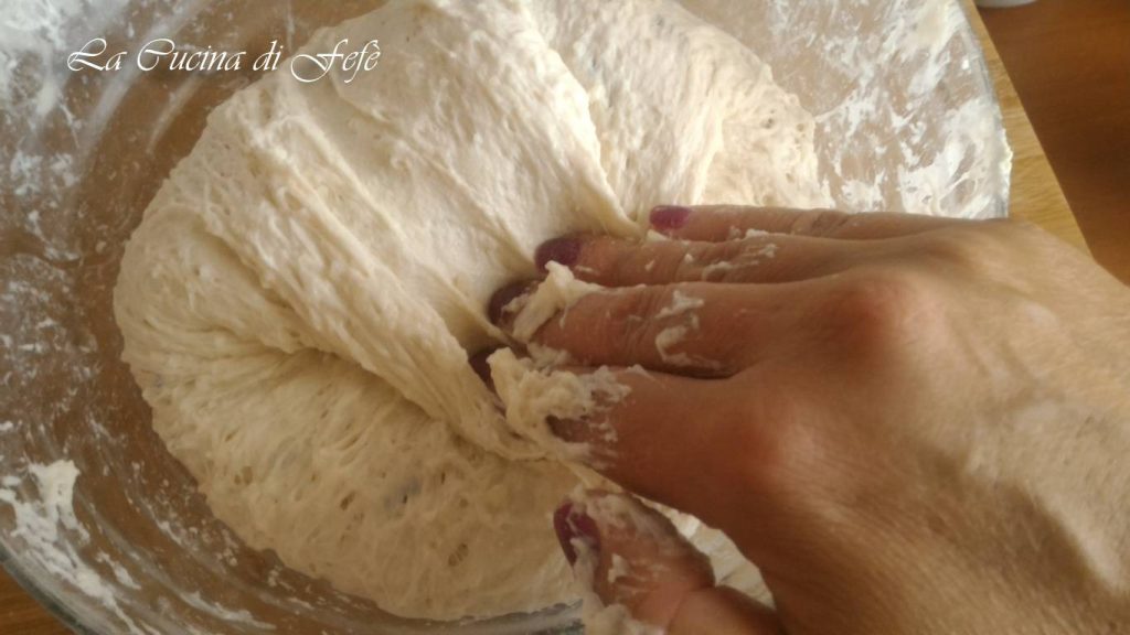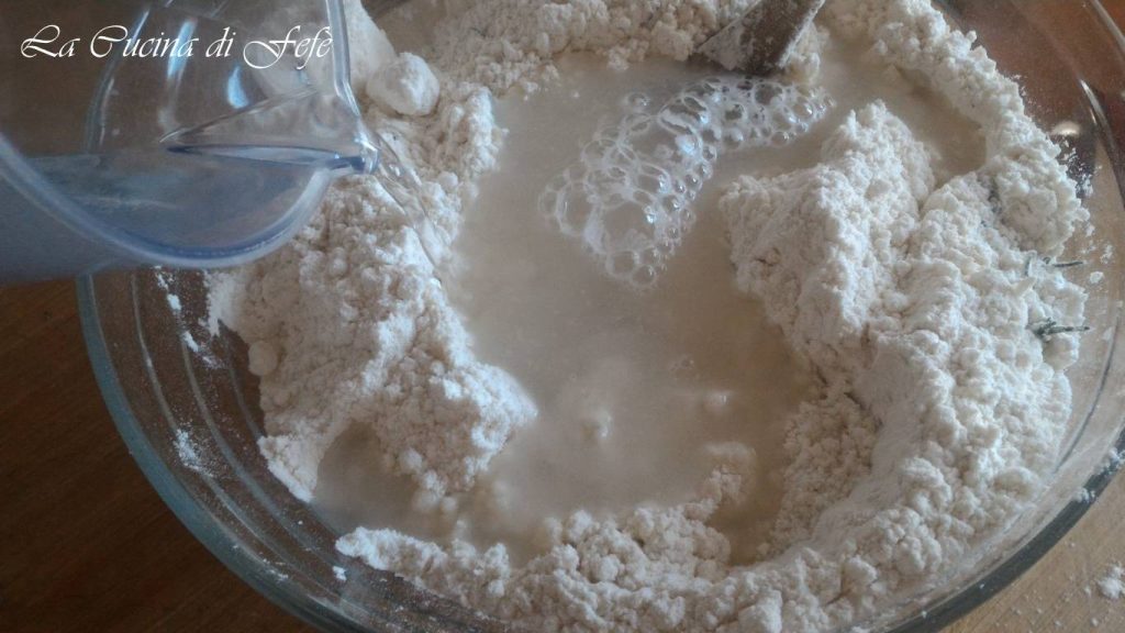 Enfin, versez l’eau tiède en filet et commencez à travailler la pâte toujours avec la cuillère en bois.