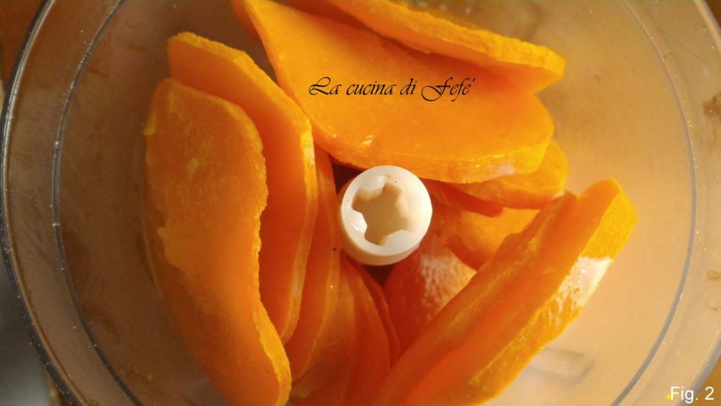 Disposez la citrouille déjà nettoyée en tranches pas trop épaisses sur une plaque recouverte de papier cuisson et faites cuire dans un four préchauffé à 190°C pendant 30′. Une fois séchées, vous devriez obtenir un poids d’environ 260 gr. (fig. 1).