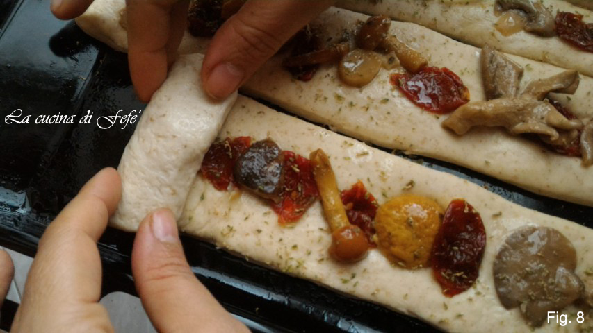 Couvrez-les avec un torchon et laissez-les lever pendant 2 h supplémentaires dans un four éteint. Puis reprenez-les et garnissez-les avec les tomates séchées et les champignons à huile bien égouttés (fig. 7).