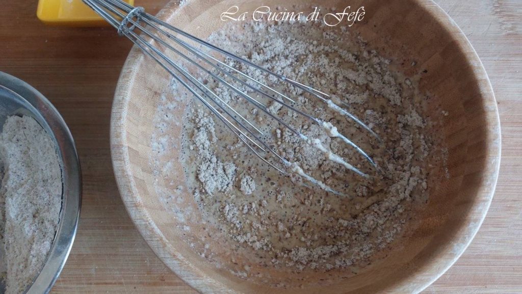 Transfère les ingrédients secs aux ingrédients liquides et travaille énergiquement avec le fouet.