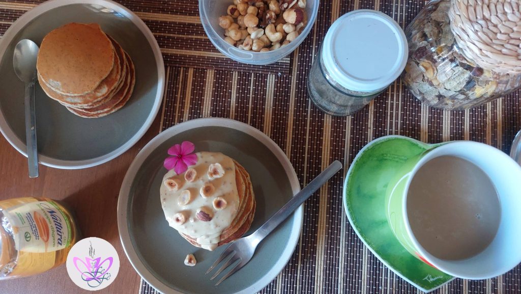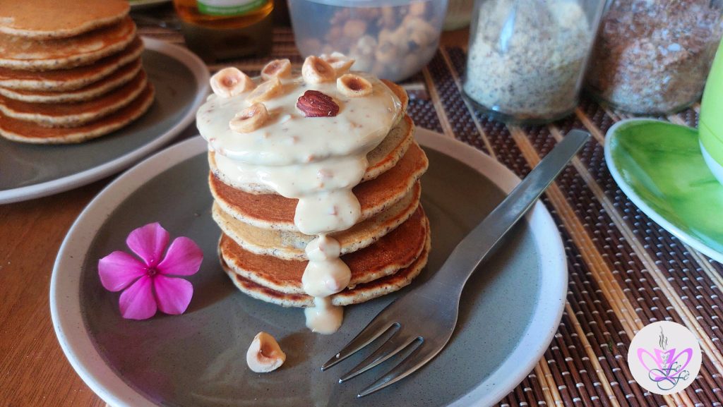 🟣 Les pancakes aux noisettes peuvent être servis, garnis avec des fruits frais de saison, avec du sirop d’agave ou simplement avec une pincée de sucre glace.