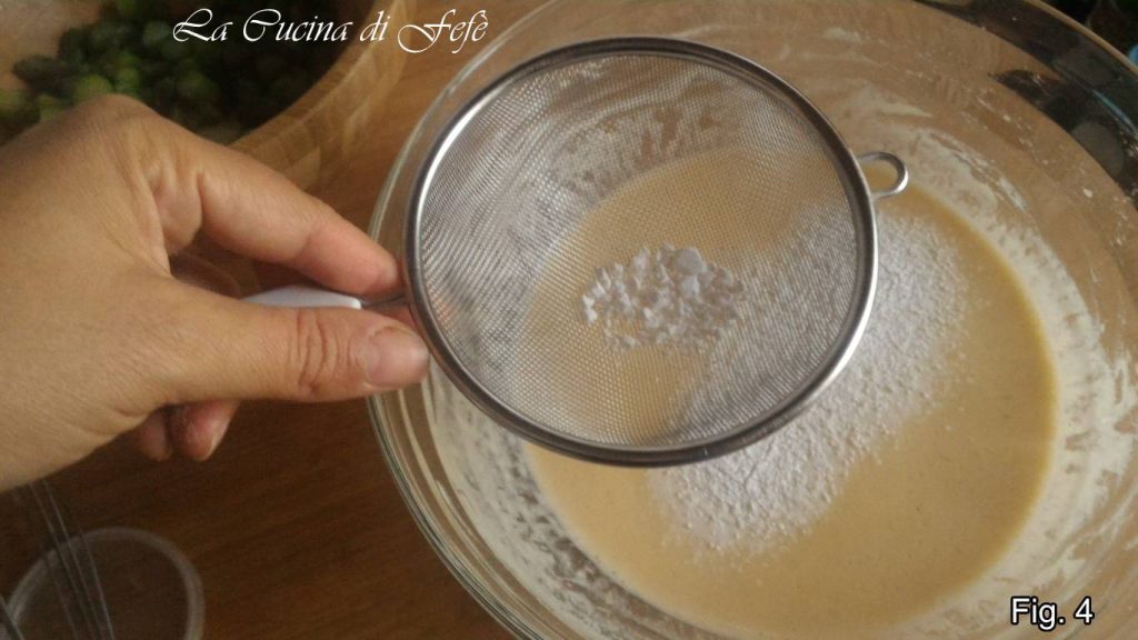 Tamisez la farine de pois chiches et la fécule de maïs dans un bol. Ajoutez l’eau en filet et commencez à mélanger avec l’aide d’un fouet à main. Ajoutez également le sel et la levure tamisée, puis remuez encore avec des mouvements circulaires de bas en haut, pour aérer la pâte (fig. 4). Assaisonnez avec la moutarde en poudre et les herbes aromatiques (fig. 5).