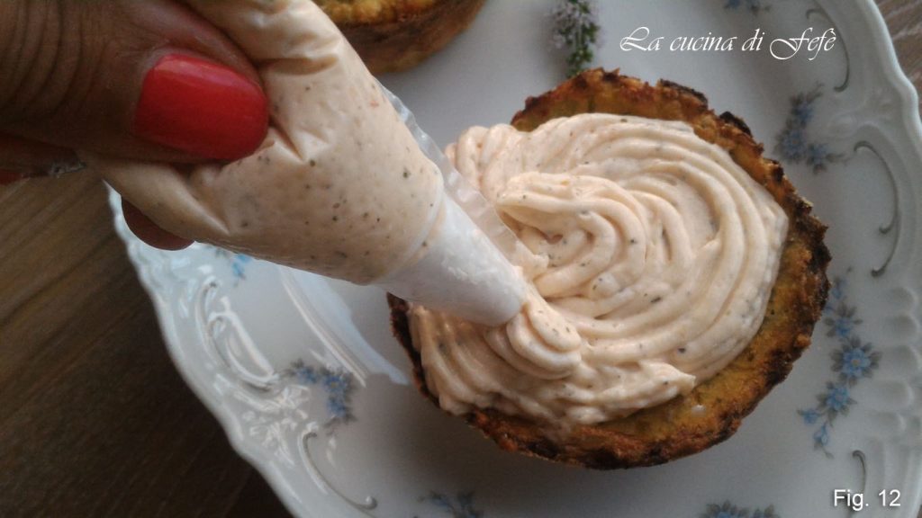 Transférez-la dans une poche à douille avec une douille en étoile. Une fois que les paniers ont refroidi, démoulez-les délicatement avec la lame d’un couteau légèrement humidifiée, puis laissez-les refroidir et remplissez-les avec la mousse de saumon et herbes aromatiques.