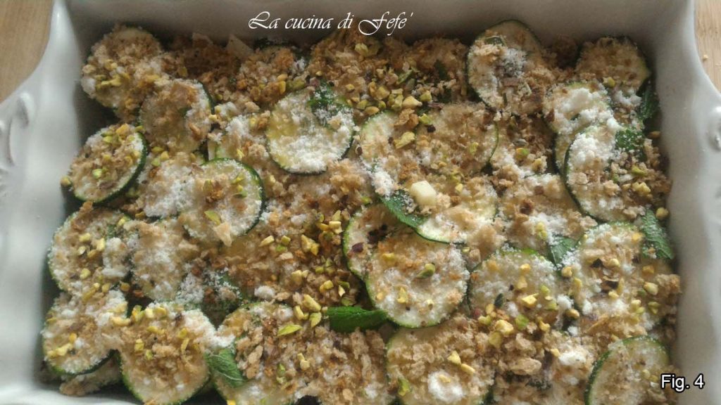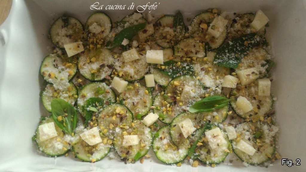 Dans un plat antiadhésif, versez deux cuillères d’eau et deux d’huile et commencez à composer la première couche de courgettes. Arrosez d’un autre filet d’huile, garnissez avec de la provola coupée en dés, quelques cuillères de parmesan râpé, quelques feuilles de menthe, une cuillère généreuse de chapelure et une de pistaches préalablement grossièrement hachées. Rectifiez l’assaisonnement avec du sel et du poivre (fig. 2).