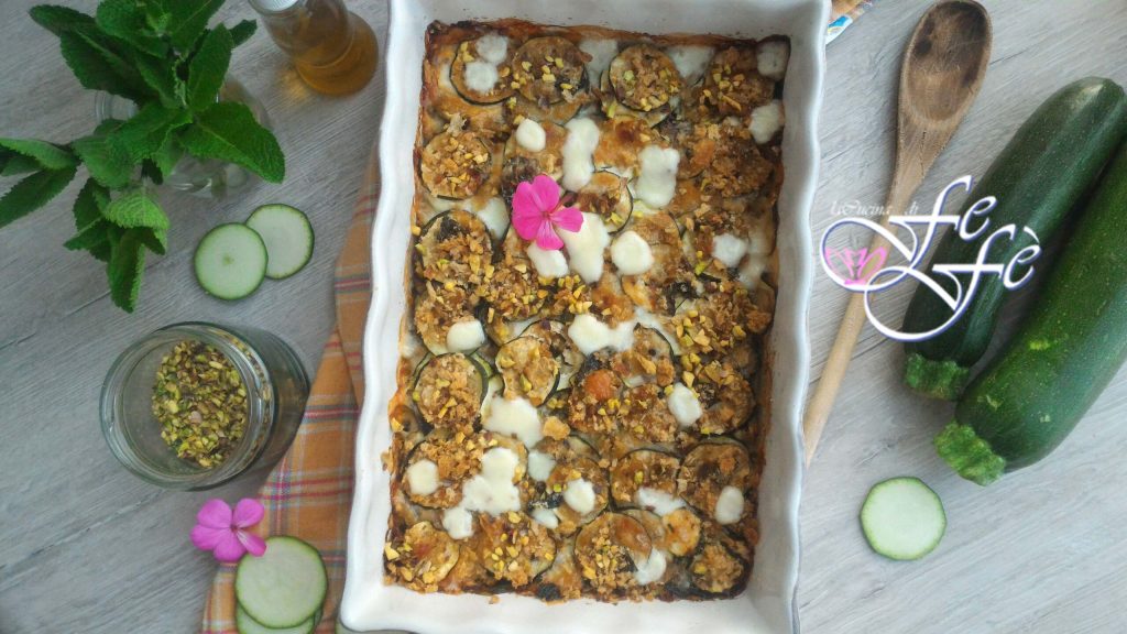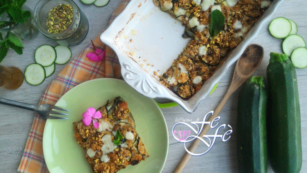 Si vous n’avez jamais essayé la version aux courgettes de la parmigiana, c’est le moment idéal pour l’expérimenter ! En réalité, c’est une deuxième version, tout aussi savoureuse que son antagoniste et plus estivale parmigiana de courgettes à la crème de poivrons et fêta grecque que j’ai préparée l’été dernier et que je vous recommande vivement d’essayer ! De plus, elle est vraiment facile et rapide si vous considérez que tous les ingrédients seront assemblés à cru directement dans le plat. Donc pas de friture mais un plat léger et sain. En outre, par rapport à la première version, j’ai opté pour une combinaison plus délicate, en ajoutant un fromage à pâte filée comme la provola et en donnant une touche de sicilianité et de croquant en saupoudrant de la pistache de Bronte entre chaque couche et sur la panure finale ! Elle sera parfaite, une fois refroidie, coupée en carrés et servie comme entrée lors d’un buffet informel ou comme plat principal végétarien. Essayez les deux versions et faites-moi savoir laquelle vous a le plus plu !